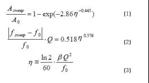 上面三式中,Asweep为振动响应峰值;A0为完全共振时的振幅;fsweep为振动响应峰值对应的峰值频率;f0为试验体的共振频率;β为扫频速度,单位oct/min;Q为试验体的Q值。式(1)表示对应扫频速度,振动响应峰值的变化率(Asweep/ A0);式(2)是对应扫频速度,振动响应的峰值频率的偏移量(∣fsweep- f0∣·Q/f0)。这两个公式是通过利用单自由度振动系统的过渡振动响应计算结果得到的拟合半经验公式(下一篇文章中和无量纲参数η一起介绍)。可以通过表1,某一试验体的试验结果来得到验证。表1表明,通过扫频试验结果估算试验体Q值和共振频率时,会有百分之几的误差,需要引起注意。