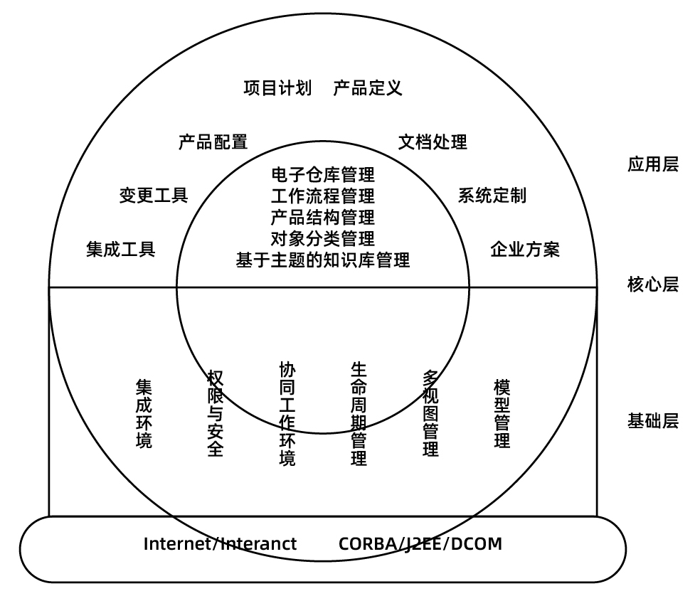 PLM的典型体系架构如图3所示,主要分为应用层、核心层、基础层和通讯层。通讯层为PLM提供一个基础网络运行环境,基础层为PLM提供公共的基础服务,核心层为PLM提供各个生命周期中对数据管理的基本功能接口,应用层主要针对企业实际运营管理的核心应用功能集合。PLM中的关键技术主要有:PLM的构件功能划分、描述及接口定义;支持产品全生命周期的元模型构造技术;分布式异构产品数据模型的映射策略和自动转换技术;跨阶段协同工作过程建模技术;基于XML的开放信息集成与动态过程联盟技术;基于语义网络的多维视图产品数据组织、管理、操作技术;基于产品全生命周期的协同工程与项目管理技术。
